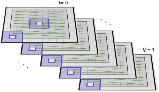 where the weights are computed by considering the pairs of SAR patches extracted from the same or a different SAR image, thus extending to the three-dimensional (3D) case that has already been developed for the two-dimensional (spatial) case. Figure 2 pictorially describes how the developed 3D NLMF method works. Further, the Q layers represent the available SAR images. When the noise in a single SAR image is filtered out, patches are extracted from the same (see the example of layer 0 in this picture) or from different SAR images. The green lines pictorially represent the moving windows that allow us to dynamically identify the reference and the adaptive patches that cover the whole picture or even a sector of every single layer into the stack of SAR images. The straightforward method proposed here was preliminarily tested on a selected test case, and the relevant results were first presented in a conference paper [102]. With respect to it, the present investigation: (i) further explores the validity of the developed 3D method when adaptatively chosen weights (Equations (3) and (4)) are used for the purposes of the analysis of heterogenous scenes; (ii) it adopts synthetic indicators to test the potential and the limitations of the method (see Section 2.3), and (iii) investigates implications for the temporal multi-looking.