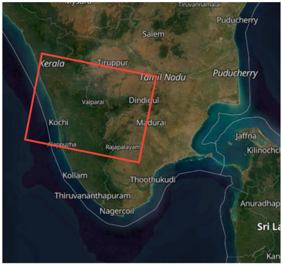 Case study area of the Kerala region, India. The red square box identifies the footprint of the used IW S1-A data collected from the descending orbits (Path 165 and Frame 558).