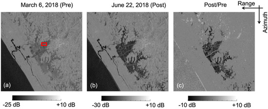 The available SAR images were preliminarily radiometrically calibrated through the Sentinel Application Platform (SNAP) [106] in order to extract, from the digital data maps of every single SAR image, the radar backscattering (sigma naught) values. It is worth remarking that, in order to evaluate the performance of the developed NLMF algorithm, the author of this investigation operated primarily in radar (azimuth × range) coordinates. Figure 4a,b show the maps of (unfiltered) sigma naught images computed over the Thrissur District on the two acquisition dates: 6 March 2018 (pre-) and 22 June 2018 (post-flood). The images were converted in log-scale (dB) for a suitable representation of the computed backscattered signal values. Figure 4c also shows the ratio image (post/pre), which corresponds to the difference between the images in Figure 4a,b. Maps are shown after a multi-look operation (with 20 pixels in range and 4 pixels in the azimuth directions, respectively) has been performed on the SAR images, thereby possessing images to show with almost squared pixels.