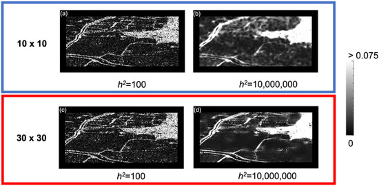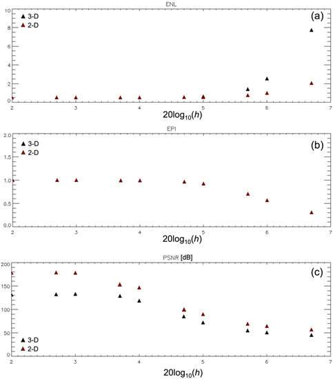 Figure 10 shows the plots of ENL, EPI, and PSLR vs. the variance of the Gaussian kernel (h2), in the logarithmic scale, which are for the two separate cases in which the 2D NLMF and 3D NLMF procedures are applied, when considering the patch sizes of the 20 × 20 SAR pixels.