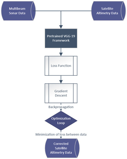 In this section, we elaborate on the related background of the CNN-based VGGNet (VGG-19) algorithm and its detailed application to the correction of the bathymetry data. As shown in Figure 1, the structure of the proposed network consists of mainly three parts: (1) the input of the truth and to-be-corrected bathymetry data; (2) the designation of the network model, requiring a pre-trained VGG-19 framework, a loss function, gradient descent, and the optimization loop; (3) the output of the corrected version of satellite altimetry-derived bathymetry data.