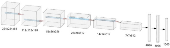 The structure of VGG-19 is displayed in Figure 2. The entire network uses the exact size of convolution kernels (3 × 3) and maximum pooling kernels (2 × 2). The combination of several small filter (3 × 3) convolutional layers is better than a large one (5 × 5 or 7 × 7) as in the previous models. Since the convolution kernel focuses on expanding the number of channels and the pooling kernel focuses on reducing the width and height, the architecture is more profound and broader. At the same time, the increase in calculation slows down, showing the network a larger receptive field. At the same time, the network parameters are reduced, and the ReLU (Rectified Linear Unit) activation function is used multiple times to create more linear transformations to enhance the learning ability.