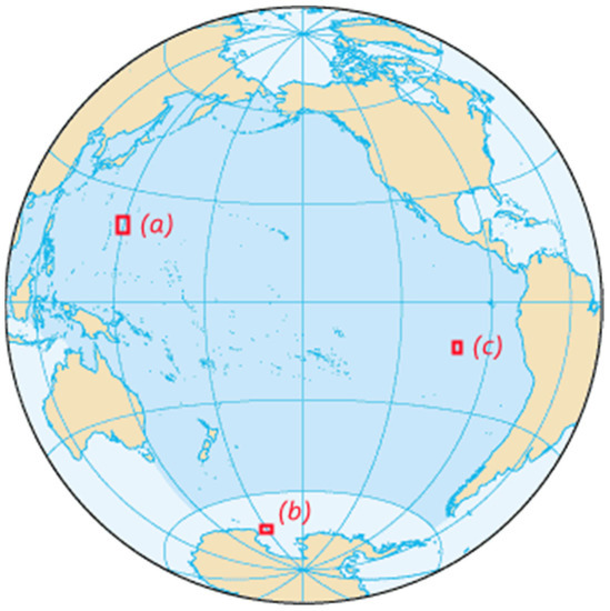 Location of the acquired bathymetry data in (a) West Pacific, (b) Southern Ocean, and (c) East Pacific.