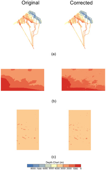Bathymetric maps of (a) West Pacific, (b) Southern Ocean, and (c) East Pacific before and after correction.