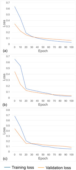 The loss function is applied to estimate the gap between the output value of the model and the truth value to guide the subsequent optimization steps of the model. The smaller the loss function value, the better the model. The loss of the training and test sets is shown in Figure 5. In all the experimental areas, the loss of the model dropped sharply to around 0.2 after 20 epochs and started to decrease gradually, especially after 70 epochs. Moreover, it shows that no apparent overfitting phenomenon is found during the computing process. It can be concluded that the VGG-19 model can effectively reduce the loss of experimental data from these three sea areas.