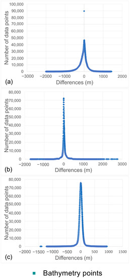 We subtract the corrected water depth values of the satellite altimetry data from the truth value of the multibeam sonar data and then find that the distribution of errors between the two is in the form of high in the middle (zero) and low on both sides, that is, the closer the error is to 0, the greater the number of data points is, and vice versa, as shown in Figure 8. In the West Pacific data, the data point with zero error as the maximum value is isolated, not continuous with the rest of the curve, indicating that the VGGNet model results in significantly more error-free bathymetry points. In the other two data, the data curves are relatively continuous, decreasing from the maximum value of zero to both sides. In contrast, the Southern Ocean data curve is more convergent near zero than the East Pacific one, indicating that its correction effect is better.