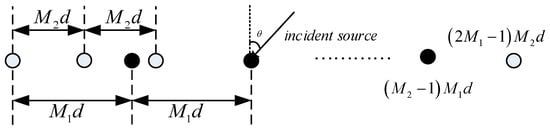 where the parameter is the wavelength of the GNSS signals, represents the spatial direction of the incident signals and denotes the position of the antenna in the extended coprime array, which are shown in Figure 1. As Figure 1 shows, the extended coprime array consists of a pair of ULAs with and elements, whose antennas are respectively located at and . Here, , and are coprime integers.