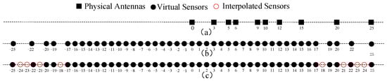 Consequently, we employ array interpolation technology in this paper to fill the discontinuous sensors in . Obviously, the interpolated virtual ULA shown in Figure 2c has elements in total, the signal of can be initialized as