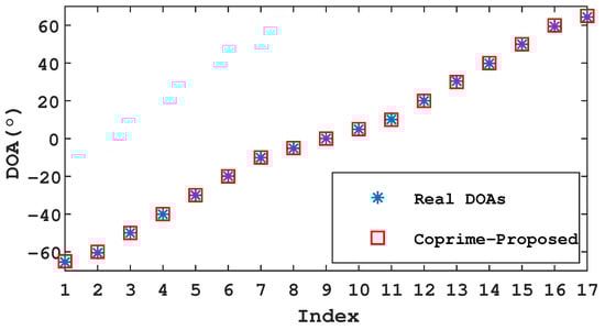 In this experiment, we assumed that the pseudo random noise (PRN) code and DOA of the incident sources were as shown in Table 2. The SNRsp was set to be dB and the parameter N = 37,000. The DOF comparison results are shown in Figure 3. It can be seen from Table 2 that the number of incident sources was , which exceeds the maximum achievable DOFs of the ULA-based Cyclic-MUSIC algorithm and the ULA-based MMUSIC algorithm, as well as the coprime array-based MMUSIC algorithm. In this case, all algorithms used for comparison except the proposed method were invalid. Thus, Figure 3 contains only the results of the proposed algorithm. As Figure 3 shows, our approach could effectively estimate all of the seventeen sources. Consequently, it is obvious that the enhanced DOFs could be obtained by the proposed frame.