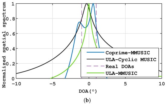 Resolution comparison results. (a) The proposed method; (b) ULA-based Cyclic-MUSIC algorithm, ULA-based MMUSIC algorithm and coprime-based MMUSIC algorithm.