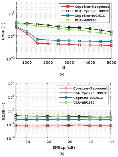 Table 4 shows the relevant parameters of incident sources. The accuracy comparison results are plotted in Figure 5. In Figure 5a, we fixed SNRsp = dB and varied N from 500 to 5000. We can see from Figure 5a that the RMSE of all the algorithms decreased with the increase in N, where the proposed method had lower RMSE compared with other algorithms. This demonstrated that the combination of array interpolation and off-grid error compensation can produce more accurately estimated results, especially when the N is finite. In addition, as shown in Figure 5a, when N was greater than 1500, the RMSE of the proposed algorithm decreased slowly as the theoretical accuracy of the proposed algorithm was limited by the Cramer–Rao bound (CRB). The CRB of DOA estimation is not only related to the number of samples N, but it is also affected by various parameters, such as the number of incident signals, array structure, the number of sensors in array and so forth []. Therefore, under the condition of the same incident signals, the RMSE of our algorithm and the coprime array-based MMUSIC algorithm had a similar change curve, owing to the same array configuration. We next fixed 37,000 when the SNRsp varied between dB and dB, this is shown in Figure 5b. We can observe in Figure 5b that our approach is superior to the other three algorithms in the whole SNRsp range. Moreover, the RMSE of all algorithms remained almost unchanged with the increase in the power of spoofing.