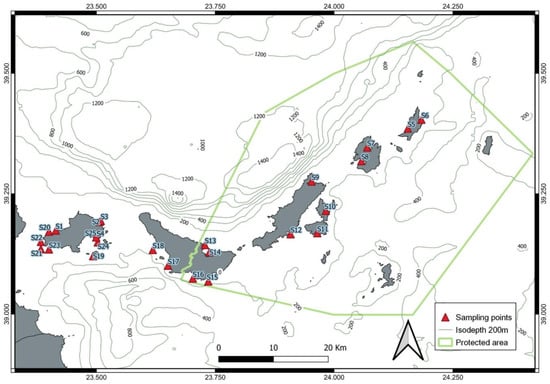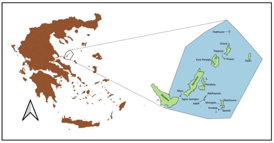 The study area is an MPA included in the Natura 2000 network, belonging, administratively, to the region of Thessaly with Region Code GR1430004, named “National Marine Park of Alonissos—Northern Sporades, Eastern Skopelos” (NMPANS). The National Marine Park of Alonissos and Northern Sporades was the first MPA established in Greece and is currently the largest MPA in Europe, covering a surface area of 2500 km2 with 93.19% being a marine area (European Environmental Agency). The site has been designated as Special Areas of Conservation (SAC) since 2011. The NMPANS includes, besides Alonissos, the uninhabited islands of Kyra Panagia, Pappous, Gioura, Psathoura, Piperi, Peristera and Skantzoura, as well as 22 uninhabited islets and rocky outcrops (Figure 1). It is an ecologically sensitive area of international importance due to its unique natural features and is characterized by an exceptionally unique dynamics in natural and cultural environment [27].