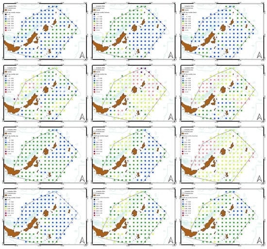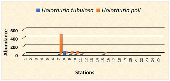 The total number of locations sampled was 25, including 12 within the limits of the MPA (Figure 2), to estimate the abundance (number of animals over large areas). Two species of Holothuria were identified during the sampling carried out in the marine park, viz. Holothuria poli and Holothuria tubulosa. In this study, emphasis was given to the 12 sampling stations. Holothuria poli (Delle Chiaje, 1824), also known as the white spot cucumber, are members of the class Holothuroidea and are Mediterranean Sea cucumbers, benthic species, living within a depth range of 0 to 250 m [61]. The species occur in tropical and temperate regions, and are highly commercially important to Asian markets due to increased demand of consumption [62,63,64]. The reproductive cycle begins in July and is completed in September. During October and November there is no reproductive activity [65]. There are no scientific studies on the biology of the species and the available information is limited to its distribution in various areas of the Greek seas.