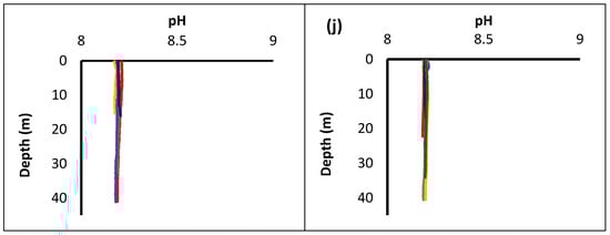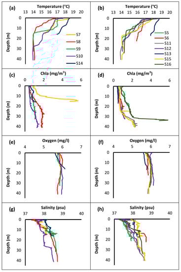 In Figure 3, the values are organized into two groups. From Figure 4a–i the parameters correspond to locations where Holothuria species are found, while from Figure 4b–j where species were not identified. The analysis showed that in stations where sea cucumbers were noticed, temperature changes most rapidly near the surface. The highest peak observed at the surface decreases rapidly up to 10 to 15 m, where in most cases is stabilized. More specifically, at stations S7 and S14, temperature started to decline below 15 m while in other stations the decline started at ~10 m. Chl-a concentration showed a significant increase at station S7 where the most Holothuria were observed. Oxygen concentration showed a slight increase at station S14, compared to other stations. Values of salinity showed the same increased pattern with no major changes at all stations. As for pH, the variation was almost identical at all stations.