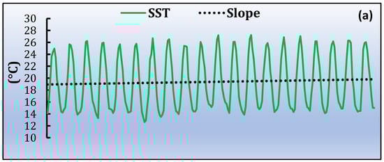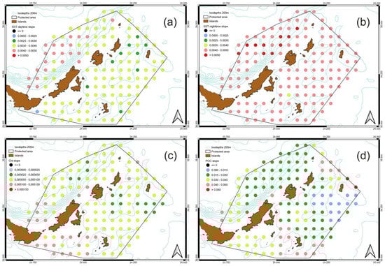 The average monthly SST slope during daytime shows that lowest values usually occur during the cold season (winter–autumn), while in warm season (summer–spring) it the highest values of SST slope are observed, especially in the northwest part of the MPA. For the whole time series, the highest increase of the SST slope is observed in the western and north-western part of the MPA. Spatially, Chl-a concentration is increased mainly in the south-western part of the MPA, while there are some regions at the center of the study area where high increases are observed during the whole time series. The POC slope shows its highest peak in the southeastern and north-eastern part of the marine park (Figure 6d).