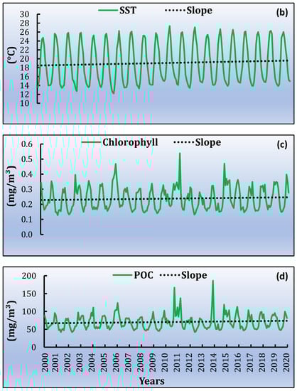 SST, Chl-a and POC data from the moderate resolution imaging spectroradiometer (MODIS) of the Terra satellite were obtained from the official website of National Aeronautics and Space Administration [NASA] and Ocean Color Web (https://oceancolor.gsfc.nasa.gov/cgi/l3, 10 October 2021). These data are managed by the Ocean Biology Processing Group (OBPG) of the Goddard Space Flight Center (GSFC). MODIS combines satisfactory spectral, spatial, temporal and radiometric resolution and, generally, provides high-quality products of geophysical parameters which are produced by applying appropriate algorithms [60]. The time series utilized covered a period from 1 March 2000 to 29 February 2020 on a monthly basis since the launch of the satellite. Both daytime and night-time SSTs were considered in this work. The data at level 3 SMI (standard mapped image) products downloaded in netCDF (network common data form) (https://oceancolor.gsfc.nasa.gov/docs/technical/ocean_level3_smi_products.pdf, 3 November 2021).