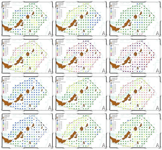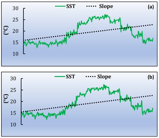 Studying the monthly trend of SST, during daytime, the trend of SST shows greater increase especially in May in the Northeast part of the MPA and in June in the western part. On the other hand, during night-time, an increasing trend is observed, except from October, in few areas in the eastern region and in small areas southeast in September. The highest increase is observed during May in the northeast part of the MPA and in June throughout the whole region. The SST slope shows significant seasonal variability. The highest increase for the whole time series, for both daytime and night-time, occurs during September, while the lowest is during October. A possible cause could be the weakening of the summer Etesian winds over the eastern Mediterranean [96,97,98], along with the sea heat capacity. For Holothuria tubulosa, feeding activity is increased during summer temperatures and is more energetic during night-time [99]. The higher increase occurs in night-time during their feeding activity and the higher trend is during May and June. This might be an indication that the feeding activity is moving to the end of spring and beginning of summer.