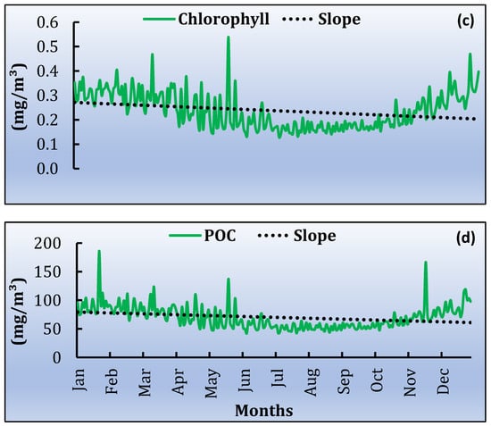 Variability of satellite products average data from 2000 to 2020 of annual trend and slope for (a) SST daytime, (b) SST night-time, (c) Chl-a and (d) POC.