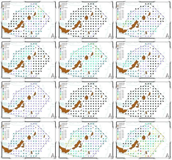 For Chl-a concentration, as recorded by the satellite data, there was a slight increase from 2000 to 2020, especially in western and south-western part of the MPA and close to the areas with abundance as well. The average monthly distribution of Chl-a shows high peaks in May reaching, in a case, over 0.5 mg/m3 and for the following months there is a decline. High concentrations are observed from November to April and the lowest value is shown in June. Therefore, during spring and winter periods the trend of concentration of Chl-a is at its highest level. The monthly slope of Chl-a indicates the highest increase mainly during May following with “patches” during June and winter months.
