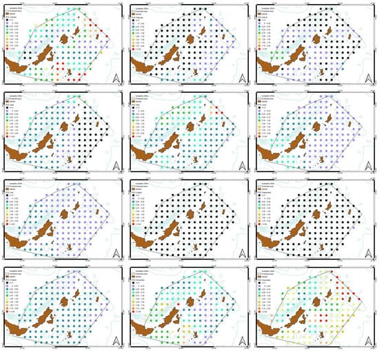 In Figure 7, the time series for each month are separated. For SST the variation does not exhibit any extreme values between the months for all the years. For Chl-a and POC, the values vary significantly according to the month and among the years. For example, the Chl-a for May is much greater than any other month and for one year exceeds any other month. Only for July, August and September the variations are low compared to the other months for both Chl-a and POC. Although this refers to the averaged values for the whole study area, it implies a considerable variation among months, which should be considered. The study, therefore, carries on examining trends for all parameters on a monthly basis, resulting in Figure 8, Figure 9, Figure 10 and Figure 11. From these Figures, the values of slopes are different from those of the entire time series, for all parameters. For example, the diversification between regions, as shown in Figure 6 and Figure 11, exhibits a different pattern.