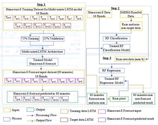 Meanwhile, the RF classification and regression training process used 30 min of data from 90 min of Himawari-8 and IMERG data within the time range of input forecasting. Then, the trained RF classification and RF regression model were used to predict rainfall and non-rainfall pixels and rain rate values from the produced 60 min Himawari-8 forecast result, and the IMERG data within the range of forecast results were used for the evaluation assessment. For example, in model Step 1, the goal of model Step 1 was to forecast the rain rate from 13:00 to 13:50, the input and target data for the multivariate LSTM training process was from 09:00 to 11:20, then the forecast input was from 11:30 to 12:50, and the predicted Himawari-8 forecast was from 13:00 to 13:50. The input data for the RF classification and regression training process within the time range of forecast input (11:30, 12:00, and 12:30), then the IMERG data at 13:00 and 13:30 was used for evaluation assessment.