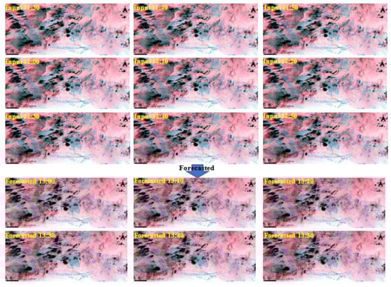The trained model could forecast 16 bands of Himawari-8 for 60 min by using 90 min of data as the input. Based on the four-step processing in Supplementary Materials, the Himawari-8 multivariate LSTM forecasting result was from 13:00 to 13:50 in Step 1, 13:30 to 14:20 in Step 2, 14:00 to 14:50 in Step 3, and 14:30 to 15:20 in Step 4. The examples for the multivariate LSTM Himawari-8 forecasting result in Step 1 are shown in Figure 4. Based on Figure 4, the trained multivariate LSTM model from Step 1 was used to forecast the Himawari-8 for 60 min (13:00 to 13:50) by using the 90 min input Himawari-8 data from 11:30 to 12:50. The forecasted multivariate LSTM result in Step 1 (as the example) shows the promised results. The result shows the forecasted 16 bands of Himawari-8 from 13:00 to 13:50 have a similar pattern to the input data. Based on the example result in Figure 4, the trained multivariate LSTM successfully forecasted 16 bands of Himawari-8 for 60 min.