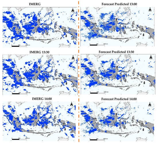 The visual comparison between IMERG data as the ground truth and forecast predicted rain rate value at 13:00, 13:30, and 14:00 is shown in Figure 6. The final result was every 10 min, but the figure just shows each 30 min for visual comparison purposes, because IMERG only provided rain data every 30 min. Based on the visual comparison result, in general, the predicted rain rate value at 13:00, 13:30, and 14:00 have a similar pattern to the IMERG rain rate value. The trained RF regression models successfully predicted rain rate values every 10 min.