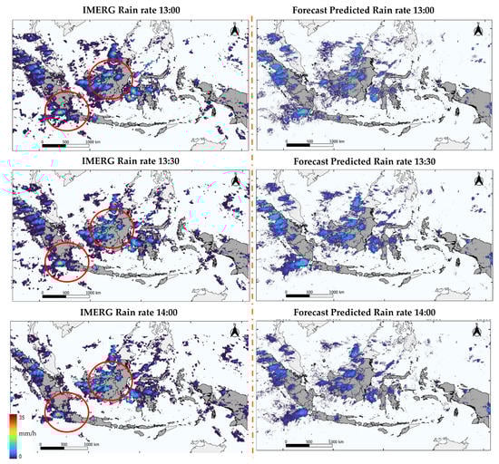 Based on the visualization results, the forecast predicted rain rate successfully predicts low to medium rain rate value, but has difficulty in predicting high rain rate value. It is related to the total high rain rate training pixels being fewer than the total low or medium rain rate value. For example, in the southwest area, there are groups of high rain rate values found in the IMERG data from 13:00 to 14:00 (red circle, Figure 6). The forecast predicted rain rate at 13:00 successfully predicts the high rain rate value in the southwest area, but the forecast predicted result at 13:30 and 14:00 just predict that area as the medium rain rate value This also happened to the central area (Kalimantan Island), there are groups of high rain rate value from IMERG dataset, but the forecast predicted rain rate only predicts that area as the medium rain rate value.