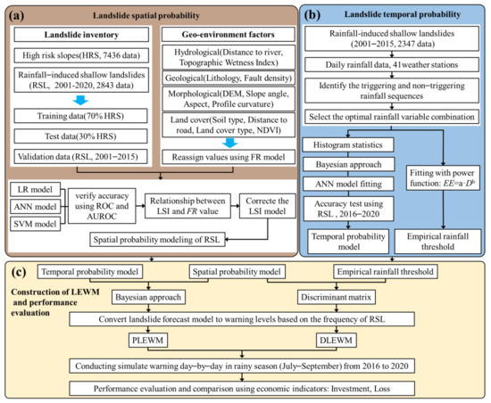 The structure of this manuscript is outlined as follows: Section 2 describes the methodologies used in this research; in Section 3, we give the experimental results, including landslide spatial probability modeling results, temporal probability modeling results, warning strategies and simulated warning results; Section 4 and Section 5 provide the discussion and conclusions.