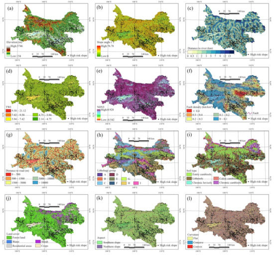 Thematic maps of the landslide-related geo-environmental factors: (a) elevation, (b) slope, (c) distance to river, (d) TWI, (e) NDVI, (f) fault density, (g) distance to road, (h) lithology group, (i) soil type, (j) land cover type, (k) aspect, and (l) profile curvature.