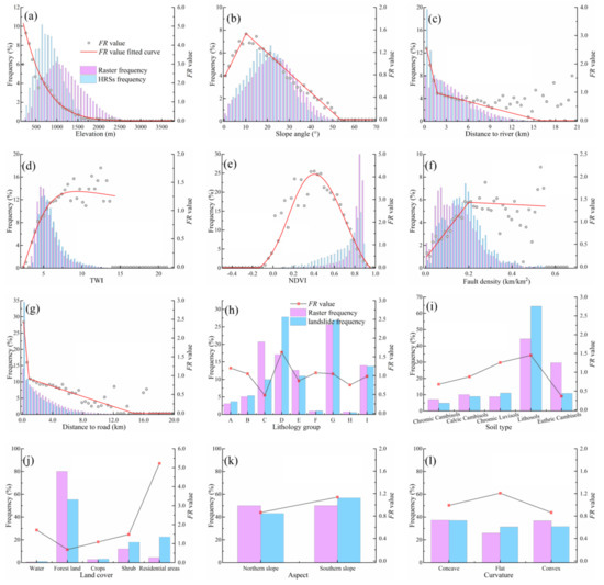 where Ni is the landslide number or landslide area within the i-th subclass of a certain geo-environment factor, N is the landslide number or landslide area in the whole study area, Ai is the area of the i-th subclass of the certain geo-environment factor, and A is the area of the whole study area, and FR is the frequency ratio value and is greater than zero, FR >1 indicates that the subclass of factors is conducive to landslide occurrence. The larger the FR is, the greater the contribution to landslide occurrence, and vice versa.