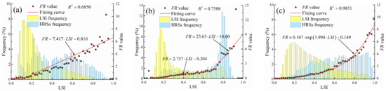 The relationship between the LSI and frequency ration value (landslide spatial probability): (a) LR model, (b) SVM model, and (c) ANN model.