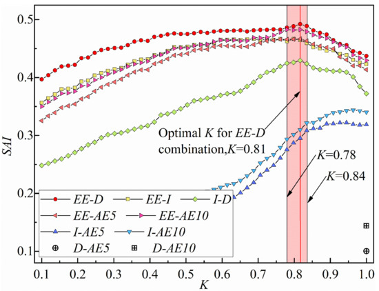The results are shown in Figure 8. It can be seen that EE-D has a higher sensitivity than the other combinations, and significantly higher than I-D combination, indicating that E-D combination is more related to landslide occurrence. This conclusion is identical to that of Gariano et al. [80], they find EE-D combination have the best performance compare with other rainfall combinations like I-D, I-EE, and they suggest that it may be due to the fact that the two variables EE-D are measured independently, while there is an interdependence between other combinations resulting in. However, further, we noticed that the sensitivity of all variable combinations with EE participation are very high, like EE-I, EE-AE5, and EE-AE10 (Figure 8). This may imply that the reason for the high sensitivity of EE-D is due to the highest correlation of EE with landslide occurrence not the cause of dependence between variables as suggested by Gariano et al. [80]. When K is in the interval from 0.78 to 0.84, the variable combinations involving EE will have the highest sensitivity; thus, in this research, we chose EE-D as the optimal variable combination and K = 0.816 as the optimal parameter.