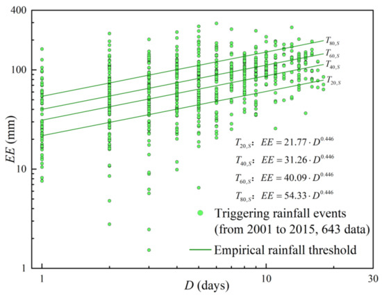 To define the empirical rainfall threshold, we use the triggering rainfall events from 2001 to 2015 and adopt the method proposed by Brunetti et al. [20] to determine the parameters in Equation (6). Here, we set four equally spaced exceedance probabilities: 20% (T20, S), 40% (T40, S), 60% (T60, S), and 80% (T80, S). The rainfall condition can be divided into five hazard levels from T1 to T5, and the equation of the threshold is shown in Figure 9.