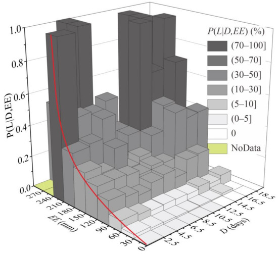 To develop a temporal probability model of landslide occurrence, we performed frequency statistics on triggering and nontriggering rainfall events in log (D)-log (EE) space. The Bayesian formula (Equation (5) was employed to calculate the posterior probability P(L|D, EE) of landslide occurrence. The results are displayed as a bar chart in 3D space (Figure 10). Under different values of D, the posterior probability of landslide occurrence always increases exponentially with increasing EE (red fit line in Figure 10), while under different values of EE, the posterior probability does not show a significant increase or decrease with increasing D. This finding indicates that EE plays a leading role in the process of triggering landslides. Therefore, it also explains why the sensitivity index of the rainfall variable combination with EE participation is much higher than that of other combinations (Figure 8).