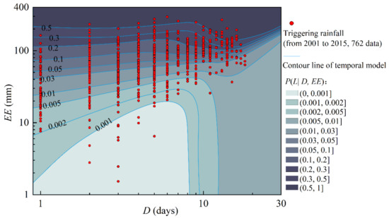 In this study, we defined a temporal probability model and rainfall threshold using landslide and rainfall data from 2001 to 2015, which contain 2347 landslides, 762 triggering rainfall events, and 85,890 nontriggering rainfall events. Landslide and rainfall data from 2016 to 2020 were used for verification, including 496 landslides, 179 triggering rainfall events, and 29,018 nontriggering rainfall events.
