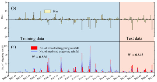 However, power-law-based rainfall threshold may have its practical limitations. First, it is only based on the rainfall data that trigger landslides (triggering rainfall) and ignores the rainfall data that did not trigger landslides (nontriggering rainfall), so part of the information is not included [17,25,26]. Second, rainfall threshold is defined as the level or the value that must be exceeded to produce a given effect or result [17], which means that it can be used to perform categorical forecasts, such as distinguishing whether rainfall can induce landslides or the hazard level of rainfall triggering landslides. However, in general, the distinction between triggering and nontriggering rainfall is not trivial, and it is more appropriate to describe the relationship between rainfall and landslide occurrence by means of probabilities [16,17,27,28]. Third, the power-law function is a relatively simple assumption, which may not fully reflect the complex relationship between rainfall and landslide occurrence in some cases [6,29].