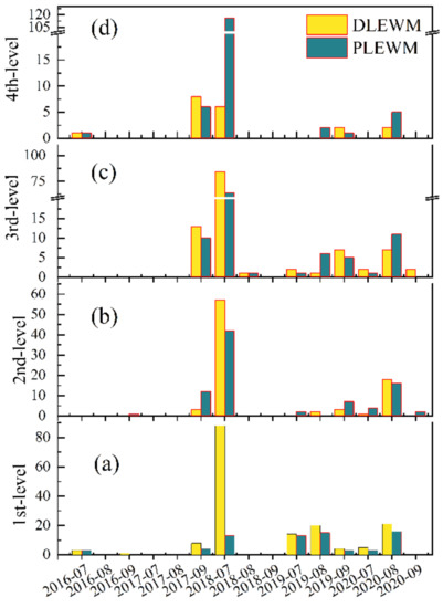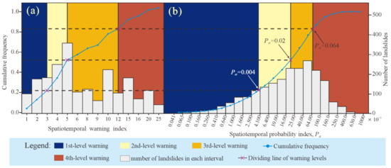 Furthermore, we still need a conversion criterion to accept the spatial-temporal probability and issue appropriate levels of warning information [6]. The process is typically expert-driven and may affect the results comparison. Therefore, we take the frequency of historical landslides as the criterion and uniformly determine the conversion method for the DLEWM and PLEWM to warning levels. Table 1 shows the recommended measures at each warning level, and the detailed conversion process can be found in Section 3.3.2.