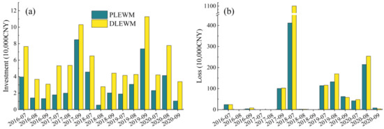 Considering that many researchers and organizations regard an early warning system as a cost-effective risk mitigation measure [6,12,56,57,58,59,60,61], the risk caused by geohazards can also be measured by economics [56,62,63]. Therefore, we think the most ideal is this kind of warning model, they issue a small area of high-level warning zones, but can predict most landslides because the small investment results in a large gain. Simultaneously, economic indicators can quantify the four mentioned aspects of the multilevel warning model. Therefore, in this research, we propose economic indicators, such as investment and loss, to evaluate early warning model performance. At the same time, we simulated warnings for the study area day-by-day in the rainy season (July–September) from 2016 to 2020 through PLEWM and DLEWM, and compared these two models.