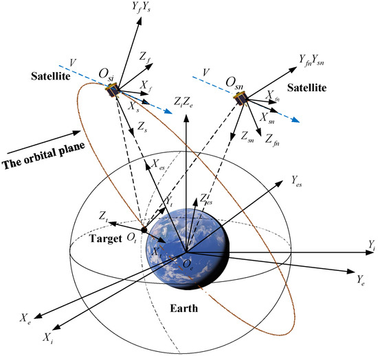 Earth-centered inertial frame : is the Earth’s center, the axis points to the vernal equinox of the J2000.0, the axis points to the Earth’s north pole along the Earth’s rotation axis, and the axis is obtained according to the right-hand rule.