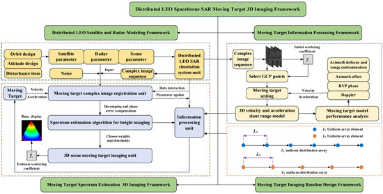 The processing flow includes four main parts: distributed LEO satellite and radar modeling, moving target information processing, moving target imaging baseline design, and moving target spectrum estimation 3D imaging. The distributed LEO satellite and radar modeling framework includes the satellite, radar, and scene parameters. It also includes the distributed LEO SAR simulation system unit, where the output is the complex image sequence. Furthermore, the proposed framework established the relative motion model and distributed SAR moving target 3D imaging model. The moving target information processing framework contains the ground control point (GCP), 3D velocity, and acceleration setting, and the moving target setting comprises the Doppler parameters, RVP phase, azimuth offset, azimuth defocus and range contamination. The moving target imaging baseline design framework performs the configuration and optimization of different baselines. Finally, all results are input into the information processing unit. The moving target spectrum estimation 3D imaging framework includes the moving target complex image registration unit where deramping and phase error compensation are carried out [27,28]. Furthermore, the spectrum estimation algorithm for height imaging and 3D scene moving target imaging are performed followed by data display [29].