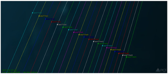 For SC1, SC2, SC3…SC20, the simulation conditions are as follows. Table 1 reports the spacecraft’s orbit parameters, where a is the semi-major axis, e is the eccentricity, i is the inclination, Ω is the right ascension of ascending node, ω is the argument of perigee, and f is the true anomaly.