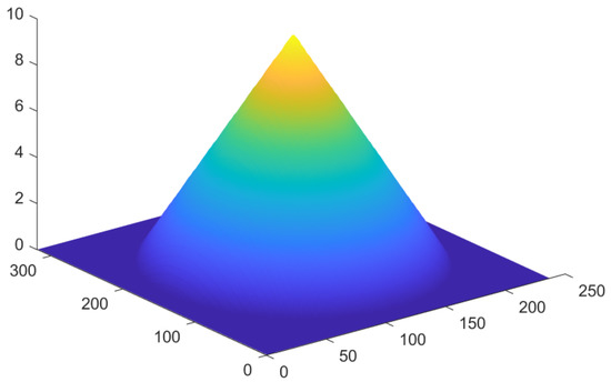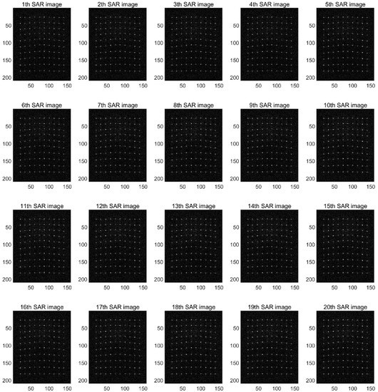 Through the distributed SAR simulation imaging system, 20 sequence images are obtained. The first trajectory image is used as the reference image, and the other images are registered with the first image. The interference phase is then calculated to find the image’s ground control point (GCP) (this paper sets 100 GCP points). We then find the reference slant distance, divide the grid using the spectral estimation method, focus the entire image, and finally achieve height-directional imaging. Figure 12 shows the 20 SAR images of the cone scene by GCP points.