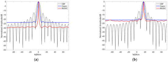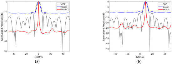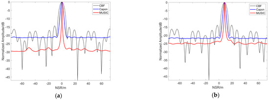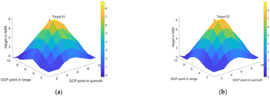 The results presented in the following figures are based on the spectral estimation method. Figure 13 illustrates the ground truth of the 3D scatter model, Figure 14a,b is the 3D imaging result under 20 and 10 tracks, respectively. Compared with the points corresponding to the ground truth, we observe that the 3D imaging result based on 100 GCP points presents a certain error relationship between them. Figure 15 presents the imaging results of the 1st and 55th points for 20 tracks, and Figure 16 shows the imaging results of the 1st and 55th points for 10 tracks. Both figures highlight that the NSR direction is offset by a certain distance, corresponding to a height of 8.4961 m for Target S1 and 8.2695 m for Target S2. The imaging error of this point is also smaller. Overall, the results reveal that when the total baseline length remains unchanged, the larger the baseline interval, the higher the height resolution.