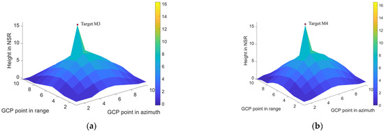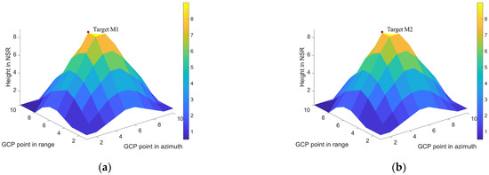 The above figures highlight that the 3D imaging result based on 100 GCP points has a certain offset error between them that is relative to the corresponding points in the static state. In the NSR direction, the result corresponds to a height of 8.9961 m for Target M1, and 8.7695 m for Target M2.