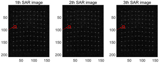 Case 1: We set the point in the 5th row and the 6th column (the 55th point) as the moving target point (the red arrow), where for the moving target, its range velocity is vx = 0.1 m/s (preventing range contamination). The corresponding results are presented in Figure 17, Figure 18, Figure 19 and Figure 20. Specifically, Figure 17 shows the 1st, 2nd, and 3rd in 20 SAR images. Figure 18a is the 3D imaging result for 20 tracks, and Figure 18b is for 10 tracks. Figure 19 illustrates the imaging results of the 1st and 55th points for 20 tracks, and Figure 20 shows the imaging results of the 1st and 55th points for 10 tracks.
