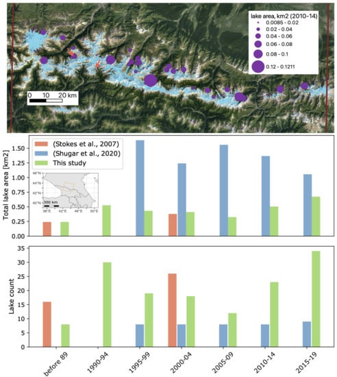 - Stokes, C.; Popovnin, V.; Aleynikov, A.; Gurney, S.; Shahgedanova, M. Recent glacier retreat in the Caucasus Mountains, Russia, and associated increase in supraglacial debris cover and supra-/proglacial lake development. Ann. Glaciol. 2007, 46, 195–203. [Google Scholar] [CrossRef]