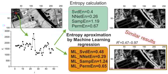 In this paper, we have developed a technique for approximating several types of entropy using ML regression: Singular value decomposition entropy, Permutation entropy, Sample entropy and Neural Network entropy. The block diagram of the two approaches to calculating the entropy is shown in Figure 1. The input data are the time series, and the output is the value of the entropy of the time series. In the first approach, the entropy can be calculated by the use of standard techniques, for example, using well-known algorithms for calculating SvdEn, SampEn, PermEn and NNetEn. In this work, we have shown the existence of another approach in which each type of entropy can be approximated by ML regression which is trained on the training dataset. Each regression model was trained on time series of a certain length and for a certain type of entropy. The entropies that were calculated using ML regression are denoted by the prefix ‘ML’. The paper presents training and testing datasets. The application to remote sensing is shown by calculating the 2D entropy distribution of Sentinel-2 images, and R2 estimates of the approximation error were made. It is shown that the best model of ML regression is the gradient boosting algorithm, in which the standard entropy practically coincides with the result of ML regression. The performance of the entropy approximation model on short time series up to N = 113 elements is shown. The versatility of the model is shown on a synthetic chaotic time series using Planck map and logistic map.
