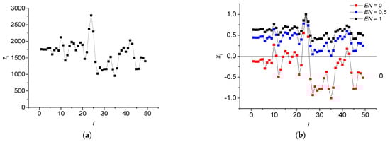 An example of the time series Z (N = 49) (a) and the result of its normalization to the X series for EN = 0, EN = 0.5 and EN = 1 (b).