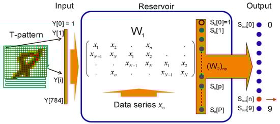 Neural network entropy is the first entropy measure that is based on artificial intelligence methods, and it was introduced in [] for 1D time series (NNetEn1D), and then, it was extended to calculate the entropy of 2D images (NNetEn2D) []. It computes entropy directly, without considering or approximating probability distributions. NNetEn is computed using the LogNNet neural network. The LogNNet model [] was originally designed for recognizing handwritten digits in the MNIST dataset [] with 60,000 images for training and 10,000 images for testing. It comprises three parts (see Figure 3): the input layer, a model reservoir of matrix W1 to transform the input vector Y into an intermediate vector, and a single layer feedforward neural network transforming vector Sh into digits 0–9 in the output layer Sout.